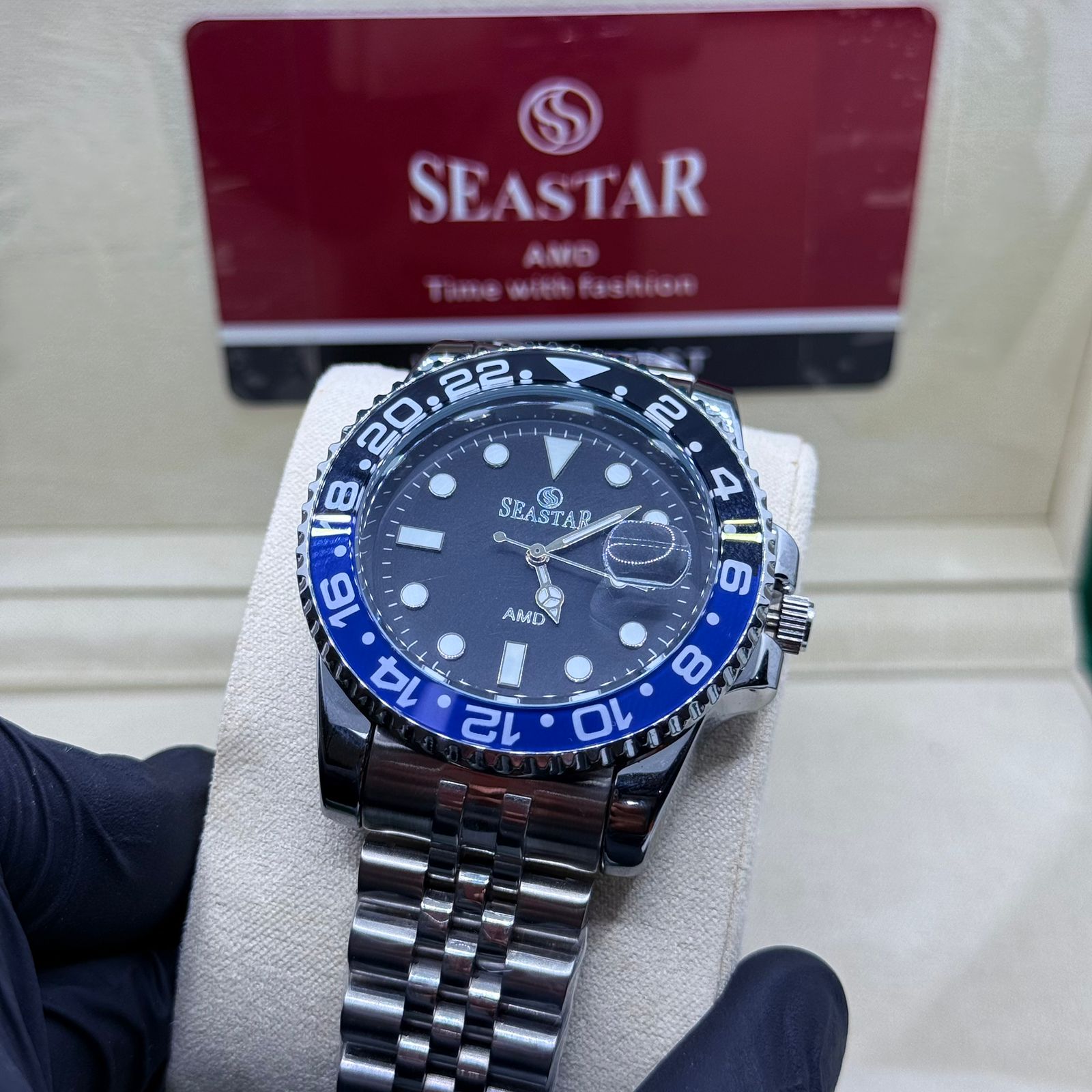 • Rotating Bezel: Dual-tone red and blue bezel for a bold, sporty finish.